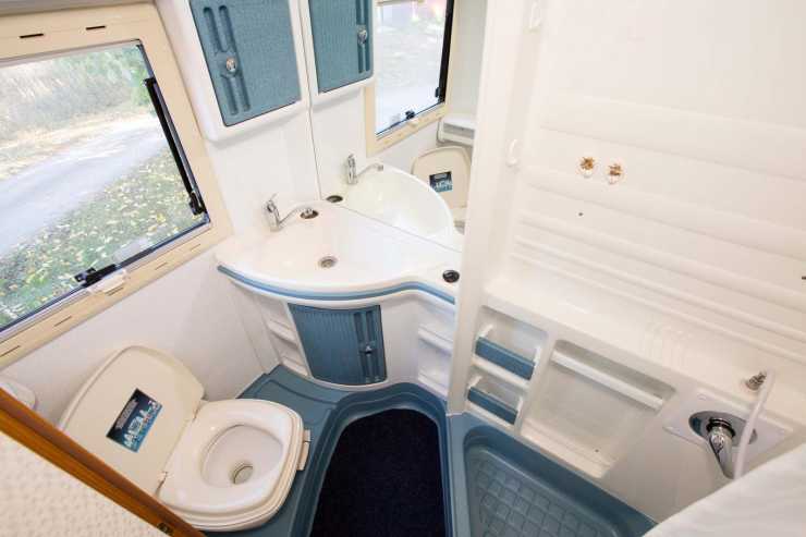 I det bakre, vänstra hörnet av bilen, finns hygienrummet. Ett fönster i bakstammen, strax ovanför toaletten, släpper in ljus. På motsatt sida en duschplats. Hela badrummet är byggt som en inplastad modul men trots det, rekommenderar vi ett fukttest i en mer än 10 år gammal bil. Ja, det gäller vilket begagnat fordon som helst.