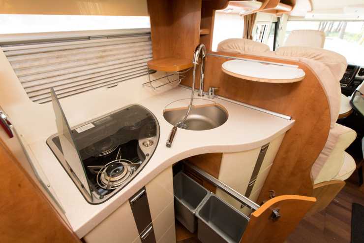 Backspeglarna kallas ”Carthago bestwiew” men om de är bäst låter vi vara osagt, men de är väldigt bra i alla fall. Vår bil har en backkamera med dubbla linser där den ena filmar rakt bakåt och bilden visas under färd. Den andra är riktad neråt och aktiveras när backen läggs i. Backkameradisplayen är placerad till vänster om föraren i samma riktning som vänster backspegel vilket är väldigt praktiskt under backning. Inne i bilen är det snyggt och prydligt. Linjerna är genomgående mjuka utan räta vinklar vilket ger något av ett organiskt intryck. Möblerna är skruvade, limmade och pluggade och i kombination med trätonen vildpäron både känns och liknar det riktigt kärnvirke. Det är det naturligtvis inte för det skulle bli för tungt. Handtag och beslag är även de gedigna, speciellt överskåpens luckor känns bastant monterade. Bodelen har hög finish och är välutrustad utan att för den sakens skull bli överdådigt nerhängd med prylar och dekor. Köket är ett bra exempel. Vid första anblicken ser det ganska standardbetonat ut men det visar sig ha en hel del smarta lösningar. Till vänster om köket finns ett apotekarskåp som går från golv till tak och är perfekt för förpackningar och flaskor. Diskhons täckskiva kan delas och skivorna kan användas som extraytor. Underskåpets lådor är skönt dämpade och det finns två stora sopkorgar. Pricken över i är en neddragbar kaffebryggare i ett av överskåpen. En snygg men onödig detalj är en fastmonterad äggklocka. Det känns som en detalj som kan skippas till generation två anno 2015. Nu har de flesta mobiltelefoner med timer. Sovrummet domineras som brukligt är av sängarna. De är sköna och höga. Det senare har sin förklaring i de stora lastutrymmen som finns under. Här ryms det mesta och lite till.