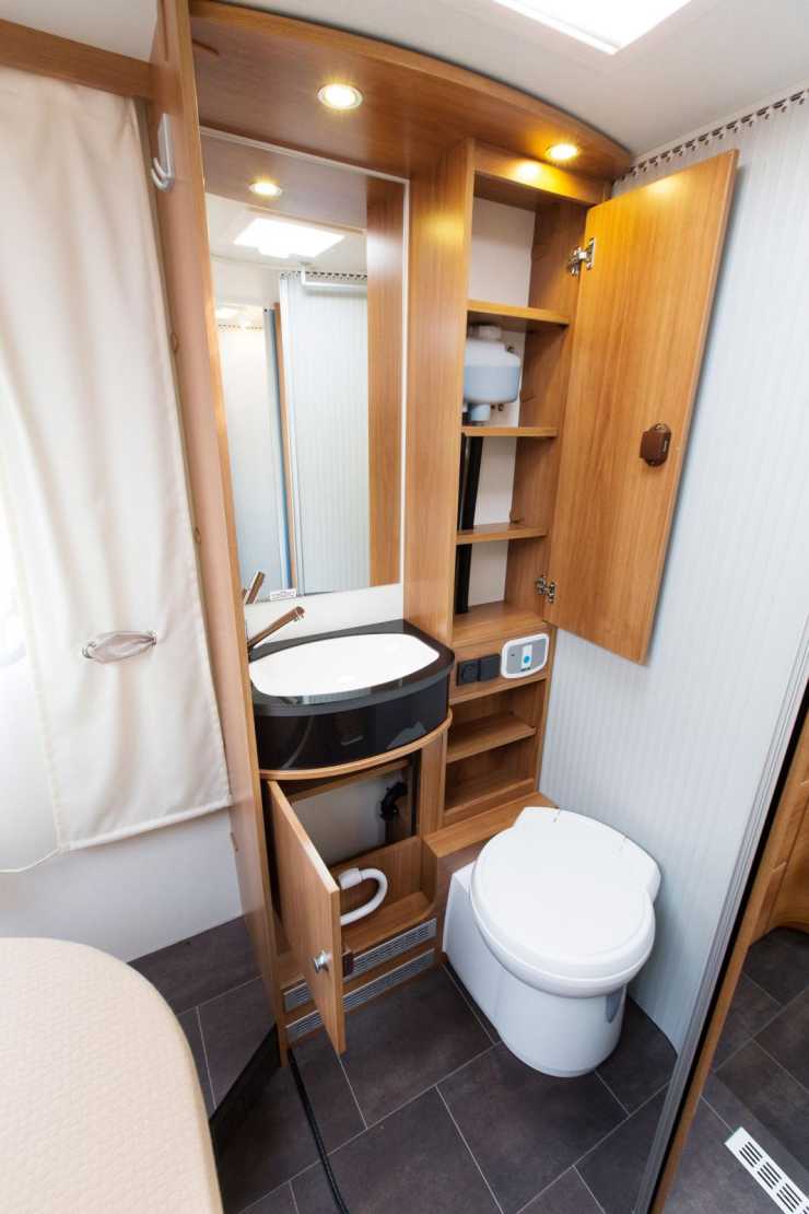 Toaletten utgörs av en fristående toa på golvet samt skåp, spegel och handfat mot ytterväggen. Det funkar bra förutom att det är lite ont om plats kring handfatet, det löses genom att öppna skåpet direkt till höger och använda de hyllplan som finns där. Duschen är hyfsat rymlig men vi saknar en stång att hänga blöta kläder på, en sådan finns på toaletten, men där inne finns ju inget duschkar som fångar dropparna. Bilens garage är optimerat utifrån det faktum att det finns en cykelhållare på utsidan. Då behöver inte höjden i garaget utnyttjas maximalt. Istället har en extra golvskiva monterats vilket ger ett stort fack längst ner med gott om plats för hopfällda bord och stolar. Ovanpå finns då ett helt plan ledigt för övrig last. Utrymmet är uppvärmt och de ömtåliga konvektorerna skyddas från stötar av skyddsplåt. I övrigt är bilens däckreparationssats fäst mot väggen här och så även den tidigare nämnda golvmodulen från sittgruppen. Det som återstår att redovisa är bilens taksäng. Den manövreras med muskelkraft och inte med elmotor. Det är många som föredrar den lösningen då det är billigare, väger lättare samt minskar risken att sängen ”fastnar” om batterikraften tryter. Däremot är det svårt att se hur två vuxna ska få plats i taksängen. Den smalnar av från 140 cm till endast 100 cm vilket är lite väl trångt. För en person är den däremot utmärkt. Den har ribbotten och givetvis finns fallskydd. En rolig detalj är att det finns en lucka utan skåp innanför placerad under sängen. Den ger intrycket av en hel radda överskåp mellan kök och förarhytt. Men den fälls istället upp när taksängen dras ner.