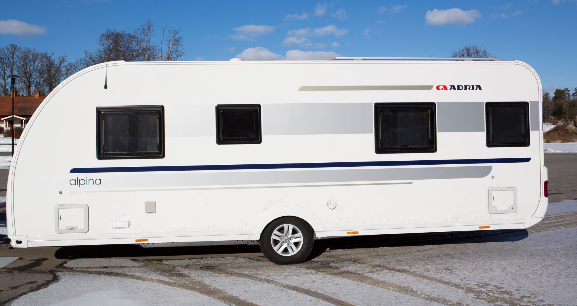 Mycket av framgången beror på Adrias lyhördhet för lokala marknader. Exempelvis den nordiska marknaden som ofta önskar vattenburen värme och vinteregenskaper. För att tillmötesgå detta finns Alpina-serien som funnits några år och till 2013 fått några uppdateringar. Baklyktorna och bakstammen har fått ny design liksom fronten som fått en mer enhetlig design. Till exempel de fyra kromade rangerhandtagen som är snyggt integrerade i karossen. Vi hämtar vår testvagn hos Hansen Caravan i Upplands Väsby norr om Stockholm och rullar iväg längs landsvägen i södra Roslagen. Vagnen vi drar är utrustad med ett pluspaket för 11 000 kronor där säkerhetskopplingen Al-Ko AKS 3004, aluminiumfälgar, mikrovågsugn och myggnätsdörr ingår. Det finns även ett tillval med namnet UT Supreme med vattenburen golvvärme och ett pristilllägg på 9 000 kronor. Elektrisk golvvärme är för övrigt standard på alla Alpina. Alpina 613 UT har en tjänstevikt på 1720 kilo men är lättdragen bakom vår dragbil. Dagen till ära har vi vår nya dragbil, en Volkswagen Passat med 4-hjulsdrift, 177 hk och DSG-växellåda. Nåväl, nu var det vagnen vi skulle testa och därför ställer vi upp den på en större asfaltsyta för att kika närmare. Stödbensbultarna fram är lätta att hitta eftersom man får hjälp av två plaströr. Baktill krävs dock att man går ned på knä. Stödbenen har för övrigt gjorts kraftigare på Alpina till detta år. Golvets styroporisolering är 34 millimeter och täcker även hjulhusen medan isoleringen i väggar och tak är 29 mm. Fronten och bakstammen är av ABS-plast medan övriga karossen är gjord av glasfiberarmerad plast. Golvet i gasolkofferten är en durkaluminiumplåt och det finns ventilationshål i botten. Här ryms två P11:or och gasregulator är standard. Till i år har förtältskanalen integrerats snyggare i karossen. I designspråket ingår även tonade fönster (Supreme har karmfönster från Seitz) där alla är öppningsbara och alla utom toafönstret har inbyggd myggnätskassett. Ett stort öppningsbart Heki II takfönster i köksavdelningen liksom ett mindre Mini Heki takfönster i sovrummet är standard och det finns takventiler i badrummet. Ytterdörren från Hartal är i ett stycke och har inbyggt fönster samt en behållare för soppåsen. Låsmekanismen fungerar bra och känns gedigen med kraftiga låspiggar. I vår vagn med pluspaket finns myggdörr. Hallen i Alpina har tre klädkrokar men ingen skolåda. Sittgruppen direkt till höger är rymlig och matbordet med teleskopiskt ben ingår i pluspaketet. Bordet mäter 92x108 cm och är lätt att trycka ihop inför transport. I ett av överskåpen i sittgruppen är det förberett för bilstereo och det finns två förmonterade högtalare samt radioantenn på utsidan. Runt överskåpen finns kanaler för varmluften att cirkulera. Bäddas sittgruppen blir bädden 224x145 cm. Det finns två tygval, dels det gråaktiga standardvalet Spotty World samt tillvalet White Leather. Under vänster soffa (i färdriktningen) finns vattentanken om 50 liter och under främre soffan hittas skidutrymmet med luckor utifrån. En nackdel med skidfacket är att det inte finns någon dropplåda utan allt ligger direkt på golvet. Under högra soffan döljer sig batteri samt elcentralen från Schaudt som kan vinklas för bättre åtkomst. Köksavdelningen har en rak bänk med fyrlågig spis där ugn, grill och bakplåtsfack ingår i standardenheten. Köksväggen skyddas från fettstänk av en mjölkvit plast som är belyst bakifrån. Diskhon har täcklock av trä som ger lite mer arbetsyta men de hade gärna fått vara skärvänliga då det inte finns någon skärbräda. Köksfläkten från Baraldi har inbyggd belysning och här finns även ett köksfönster för vädring. Ett apotekarskåp med tre trådhyllor underlättar förvaring liksom bestickfacket i en av utdragslådorna.ERBJUDANDE: