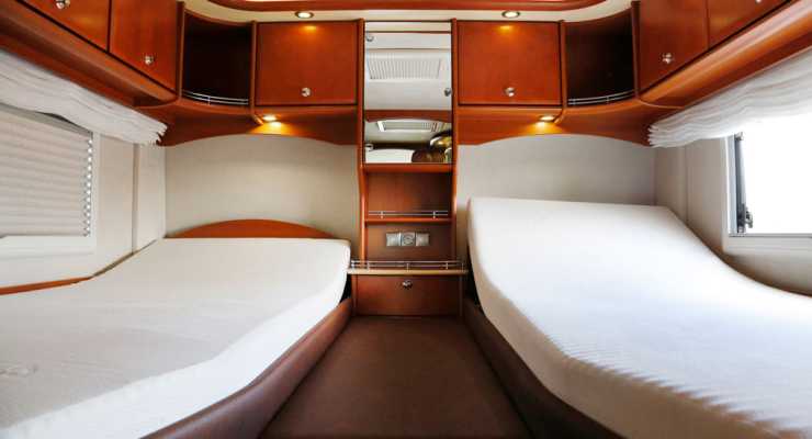 Slutligen kommer jag så till den rymliga bädden längst bak. Eller snarare bäddarna då det rör sig om två separata långbäddar som kan bäddas ihop. Madrasserna ser nya och fräscha ut och fjädrarna från Froli under madrassen är hela. I ett av trappstegen mellan bäddarna hittar jag ett säkerhetsskåp som är ordentligt fastbultat i golvet.
