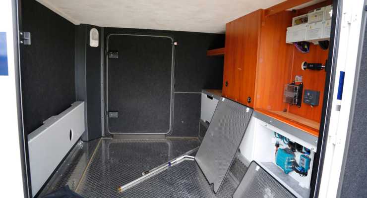 HJULKALENDER. Det finns mängder av luckor till både förvaring och teknik. El, vatten och avlopp göms bakom luckor.