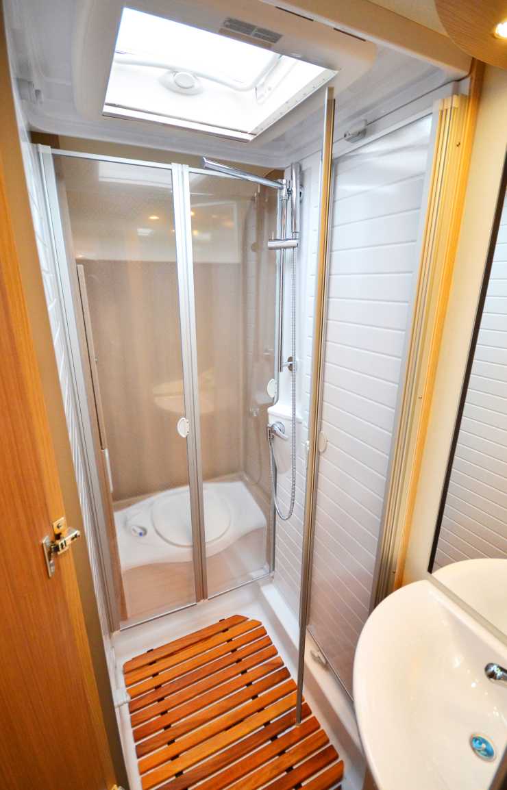 Hygienutrymmet är välplanerat. Toalettstolen är placerad vid bakväggen. Utrymmets bredd och sitthöjd är utmärkt och det krävs inga akrobatiska konster för att sitta på toalettstolen till skillnad från flera andra bilar i samma prisklass. Mellan toalettstolen och tvättstället finns ett duschutrymme med måtten 74x65x190 centimeter. Hygienutrymmets svaghet är bristen på förvaring. Det finns endast plats i hörnskåpet i underdelen av tvättstället samt lite vid väggen bredvid toalettstolen.