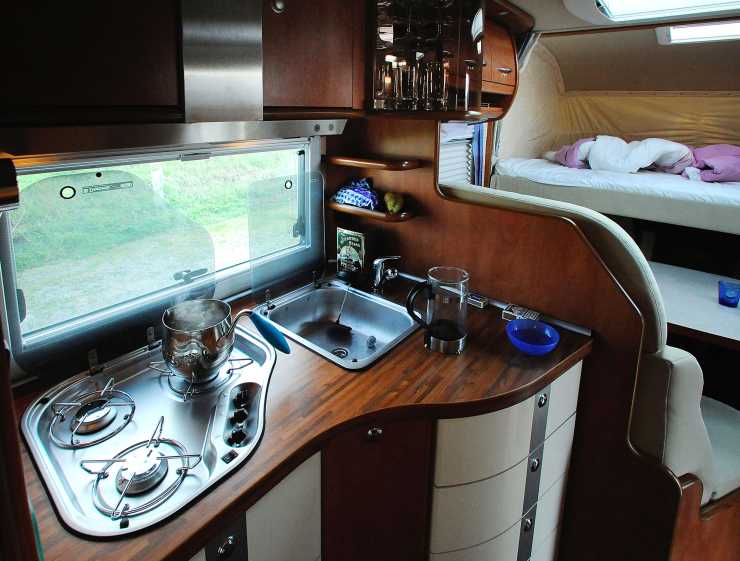 Bilens inredning är full av omtänksamma detaljer och har ett gediget hantverk med känsla för ödmjuk lyx, som kontrasterar mot naturens magiska värld med den djupsvarta vattenspegeln, de klara stjärnorna och det trolskt mjuka ljuset i den höstliga bokskogen. Tillbaka i husbilen är det lätt att anpassa belysningen så att den harmonierar med ljuset utanför med hjälp av det mjuka allmänljuset och de olika punktbelysningarna. Carthago tycks medvetet ha valt att prioritera köksdel och badrumsdel framför ett rymligt utrymme mellan de två separata bakre sängarna och sittgruppen. Köket är ett föredöme när det gäller ett guldkantat vagabondliv. En stor köksbänk i stavträimitation och trelågig gasspis med elektrisk tändning samt diskho – båda i rostfritt – med kromad engreppsblandare. Under bänken i stenimitation finns kullagrade lådor med mjukstängning samt en utdragbar hållare för två sopkärl. Över bänken finns fastmonterad äggklocka och några småhyllor.