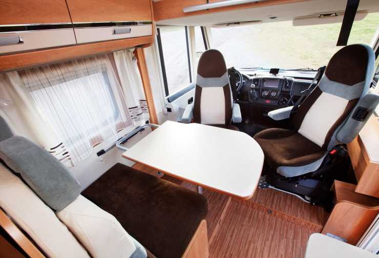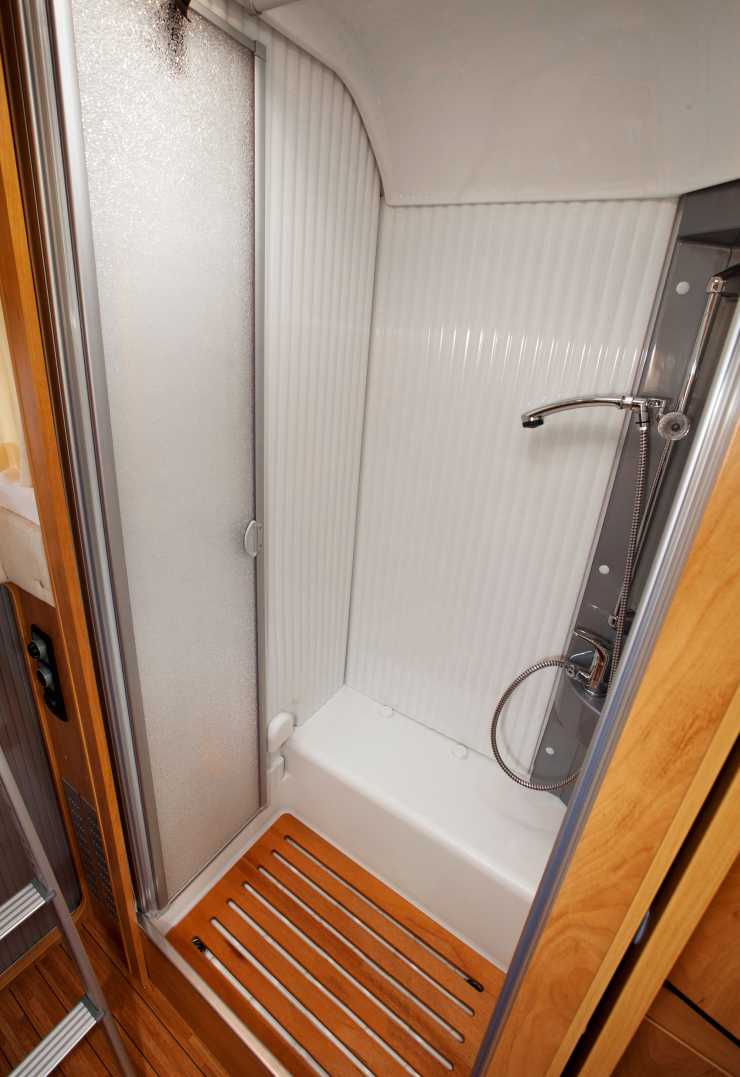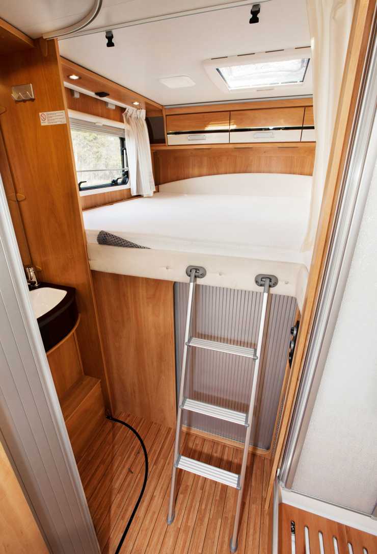 Sen följer på bilens vänstersida kylskåpet som rymmer 100 liter och har ett köldfack på 9 liter. Under kylen finns förvaring i tre utdragbara lådor och ovanför finns ett skåp med en TV-arm. På motsatt sida finns köket som har en kombinerad trelågig spis och diskho. Förvaring sker i överskåp och lådor under bänkskivan. Något det är ont om är arbets- och avstänningsytor. Sittgruppen utgörs av en rak soffa med plats för två samt de vridbara färdstolarna. Matbordet är förlängningsbart och räcker då till alla sittande. Bordet i vår bil verkar haft en tung rumpa vilande på sig för benet är aningen krökt och det rasslar avsevärt under vår provkörning. Den nedfällbara sängen fram mäter 140x185 cm. Möjligheten finns att inte ha denna säng. Ett vettigt val ifall ingen kommer att använda den, den väger en hel del. Å andra sidan är denna säng en av de största fördelarna med en helintegrerad bil. Med tanke på andrahandsvärdet är det kanske en fördel att välja en oavsett behov.