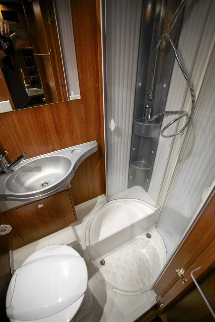 Toalettutrymmet är som väntat inte så stort, men här finns en rund duschkabin – tyvärr stående på hjulhuset med följden att där är en höjdskillnad på två decimeter, likt ett trappsteg, mitt i duschen. Ett vattenfyllt element under krokarna torkar handdukarna snabbt, och insidan av toadörren har stänger att hänga handdukar eller kläder på. Däremot är handfatet och duschkabinen av skramlig hårdplast vilket känns billigt i en bil i miljonklassen.