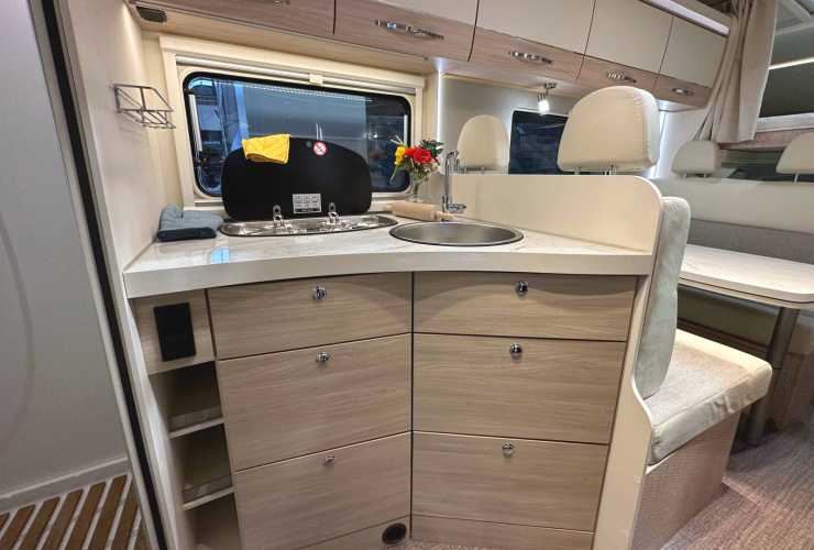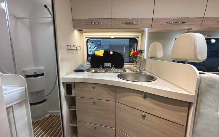 Här är det också på sin plats att nämna material och färger i inredningen. De sobra beigea och naturfärgade nyanserna i kombination med ljust trä skapar en exklusiv känsla. Det här är inte bara ett campingfordon utan ett mobilt hem dit man bjuder hem sina vänner.