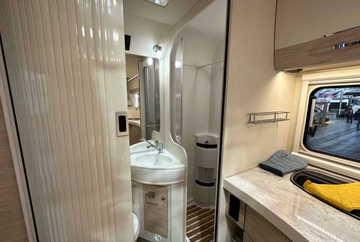 Längst bak hittar vi hygienutrymmet, dusch och toalett i ett, bakom en snygg jalusidörr. I duschen finns redan en smart stång på plats för klädförvaring eller torkning.
