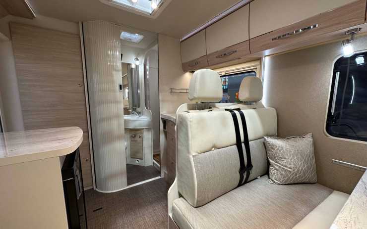Det är svårt att slå sofforna i en alkovbil och här har Eura Mobil lyckats skapa något alldeles extra, en sittgrupp med en generös längsgående soffa och två mindre platser mittemot varandra. Tillsammans bildar de en sittgrupp där ett stort sällskap får plats.
