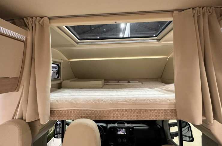 Alkovbädden ovanför förarhytten mäter 200 x 150 centimeter och ovanför den finns ett stort takfönster.