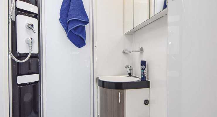 Allt som önskas finns i badrummet som har tillräckligt med förvaring och duschen är också rymlig och har två avlopp. Stor taklucka är bra.