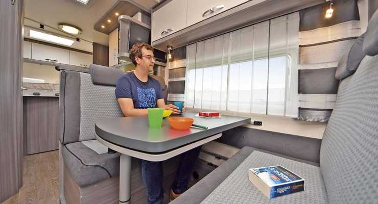 Sittgruppen i Hobby Optima Ontour, välplanerad, med material som känns mer funktionella än lyxiga. Foto: Simon Ribnitzky
