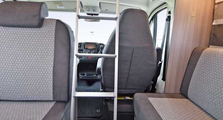 Gott om utrymme även för större familjer, eller när man får gäster, i flera soffor och även en längsgående soffa. En stege upp i alkovsängen vars liggyta kan lyftas upp för enkel passage till förarhytten.