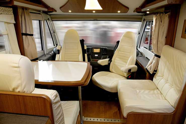 Väl inne i bilen är det första som slår mig det väldigt stora förarutrymmet och panoramafönstret med klar WOW-känsla. Mitt emot ingången, direkt bakom förarstolen, finns matplatsen med fem sittplatser och ett utdragbart matbord. Direkt till vänster om ingången, på förarsidan, är vinkelköket placerat samt en garderob.