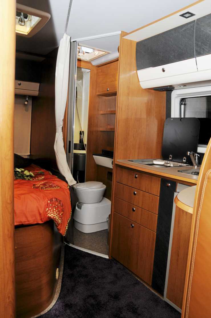 Längre fram finns ett vinkelkök och framför detta en hörnsoffa och en mindre sidosoffa på bilens högra sida i färdriktningen.