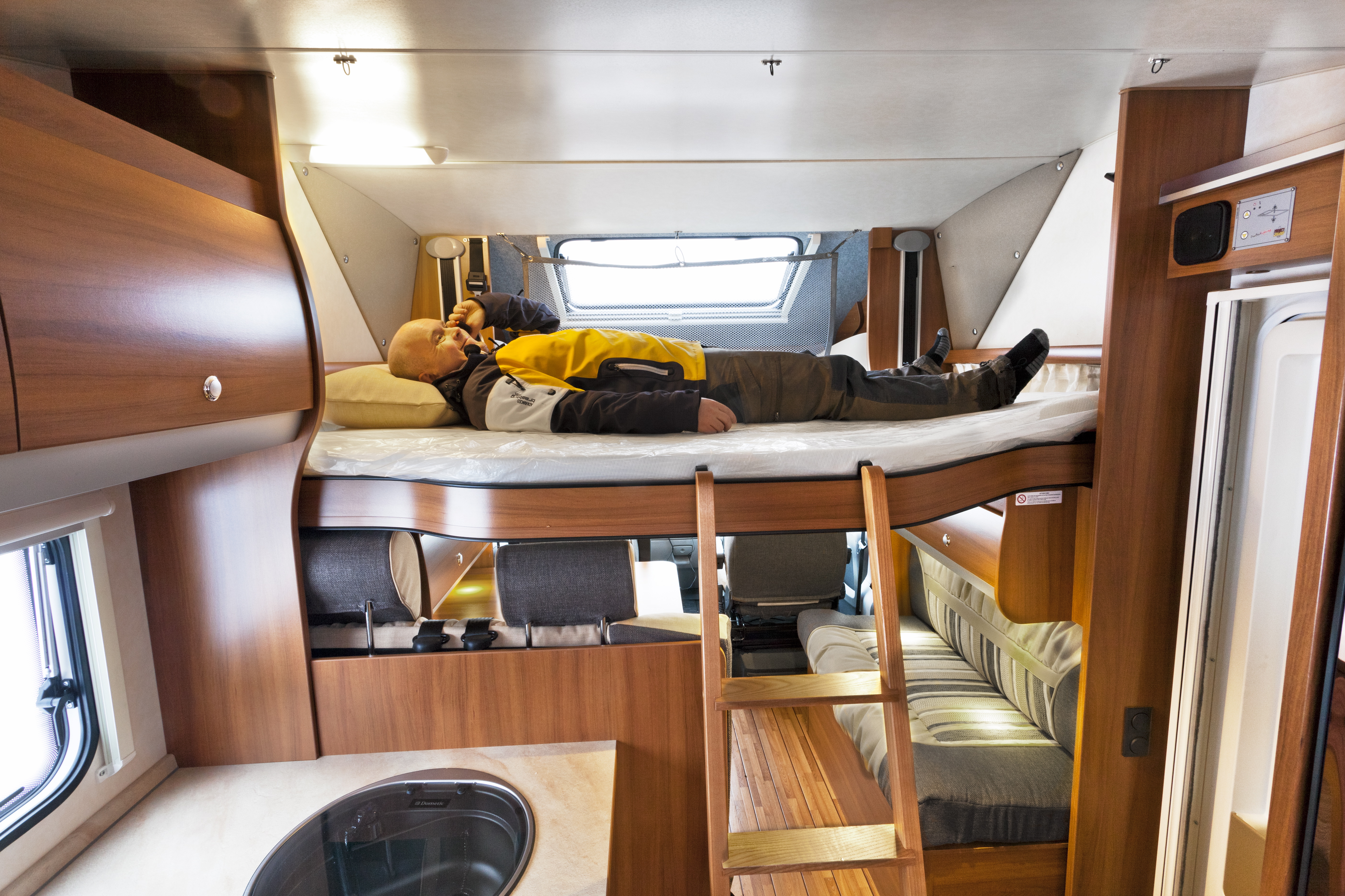 Bädden nås enkelt via en stege och de som vistas här skyddas av nät på vardera sidan. Sittgruppen blockeras med sängen nedfälld, men inte köket eller entrén, något som ofta händer med denna typ av nedsänkbara takbäddar.