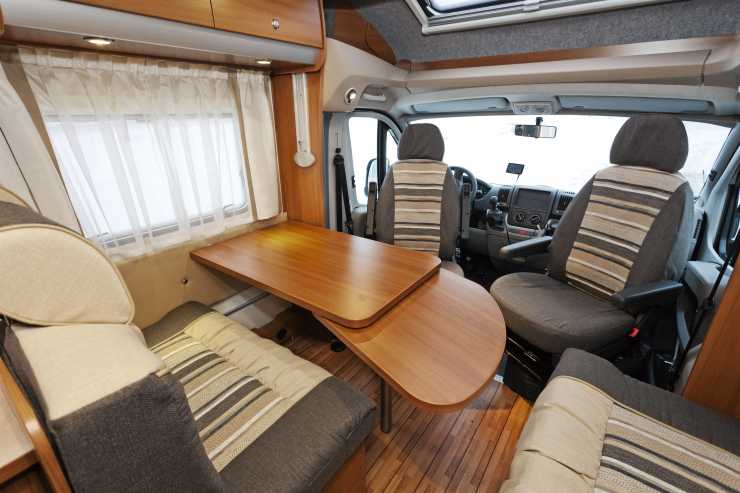 Sittgruppen består av en soffa direkt in till höger från entrén och en soffa som utgör färdplatserna. Man sitter ganska rakt i ryggen i färdsoffan men stoppningen känns bra. Jag sitter skönt. Bordet är rejält och ger ett solitt intryck. Med stolarna i hytten vända kan sex personer sitta bekvämt och mysa.