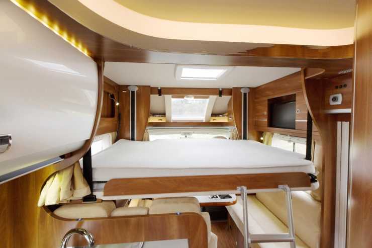 I förarhytten känns det ombonat och snyggt. Fiats fuskträ i instrumentpanelen har ungefär samma ton som inredningen i övrigt och ovanför framrutan är ett centralt placerat takfönster vackert inramat av belysta förvaringsfack och snygga skåp. Vid ratten finns en liten modul som varnar med både ljus och ljud om bilen startas med öppen garagedörr eller utfälld trappa. Det gör vi flera gånger och det ringer nästan fortfarande i öronen.