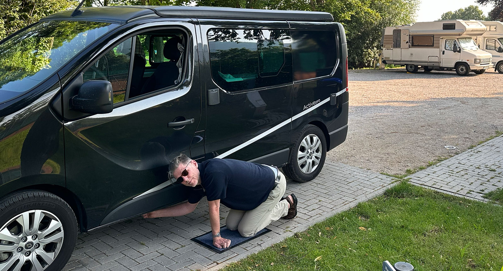 Tömning gråvattentank. Claes Johansson äger en av landets två Saab 92H husbilar. Adrian är ett rymdskepp i jämförelse. Snart kan du läsa resereportagen från hans Europatripp i campingbil.