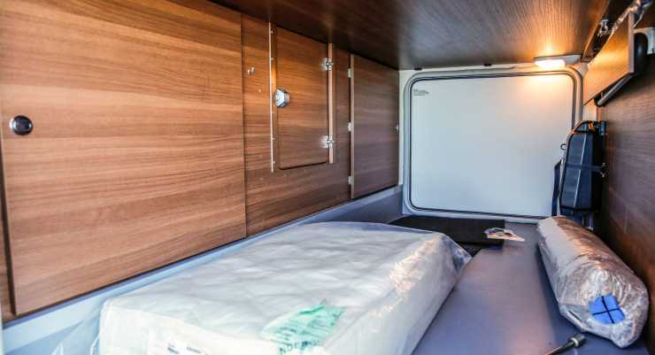 Taksängen ovanför förarplatsen är enkel att manövrera och passar utmärkt till familjens barn, även om två vuxna får plats i den 195x143 cm stora sängen (som kan upplevas som en aning trång längst fram mot husbilsfronten). Små barn kan visserligen sova i färdriktningen (max 143 cm), men tanken är att man sover på tvären, en person innanför den andre.
