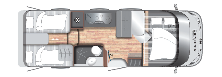 Trots att LMC Explorer Premium I 680 knappast är en bil som man använder på riktigt dåliga vägar är markfrigången imponerande. Dessutom tar sig husbilen fram över diken och branta kanter där ett långt överhäng vanligtvis innebär att husbilen fastnar.