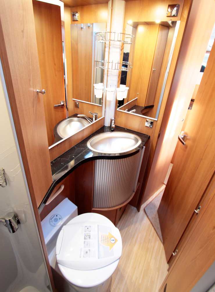Sovrummet består av en högerställd fransk bädd på 131x196 cm. Bäddens höjd från golvet är bekväma 68 cm så det behövs ingen trappa. Under sängen finns lastutrymmet som även nås utifrån. Hela bädden lyfts upp med hjälp av en gasfjäder. Under sängen finns även Alde-pannan. Ovanför sex överskåp med luckor. Läslamporna består av trendenliga LED-band. Spring-modellens hygienutrymme finns bredvid dubbelsängen och mäter hela 150x80 cm. Planlösningen är inte alls dum. Duschen bildar ett eget utrymme i det bakre hörnet, och handdukskrokarna är placerade så att man inte behöver leta efter handuken i bodelen efter att ha duschat. Två stora speglar, tandborstmuggarna med hållare samt LED-lamporna står för utrymmets lyx. I stället för Thetfords toakassett finns det här en nyhet från Dometic, som har fått beröm för den effektiva spolningen. Tömningen underlättas av kassettens hjul och handtag.