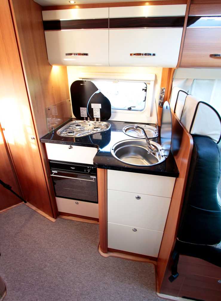 Ett L-format kök brukar vara en bra lösning, och det är det även i denna bil. En trelågig spis och två diskhoar fyller dock upp nästan hela ytan. Den mindre diskhons, eller avrinninghons, syfte förblir dock ett mysterium, eftersom den inte har ett avlopp. Vi hade gärna sett en infälld sopkorg i stället för avrinningshon. Under den trelågiga spisen finns en ugn med grillfunktion, ovanför finns en köksfläkt. På andra sidan av mittgången finns en hög 190-liters kyl-frys-kombination från Dometic. Förutom avsaknaden av sopkorg konstaterar vi att köket är välutrustat. Eftersom kylskåpet sträcker sig ända ner till golvet, finns det inte plats för en stor skolåda i hallen. LMC har löst problemet genom att bygga in en separat skohylla i det lilla skåpet. I bodelens entré finns det ett infällt fotsteg, och det finns ingen separat eltrapp. Det är en enkel och underhållsfri lösning. Insteget är 38 cm högt. Fotsteget är oisolerat vilket resulterar i att resenärerna i baksätet får lida av oväsen vid färd. I hallen finns det plats för en tv-apparat som kan ses från sängen eller de vridbara stolarna i förardelen. Placeringen är dels väldigt praktisk, men samtidigt hindrar den monteringen av en garderob i hallen. Ovanför tv-armen finns det ett vinglasskåp med dörrar som ska se ut som glas. Det ser visserligen snyggt ut, men hur nödvändigt är det i vardagligt bruk?