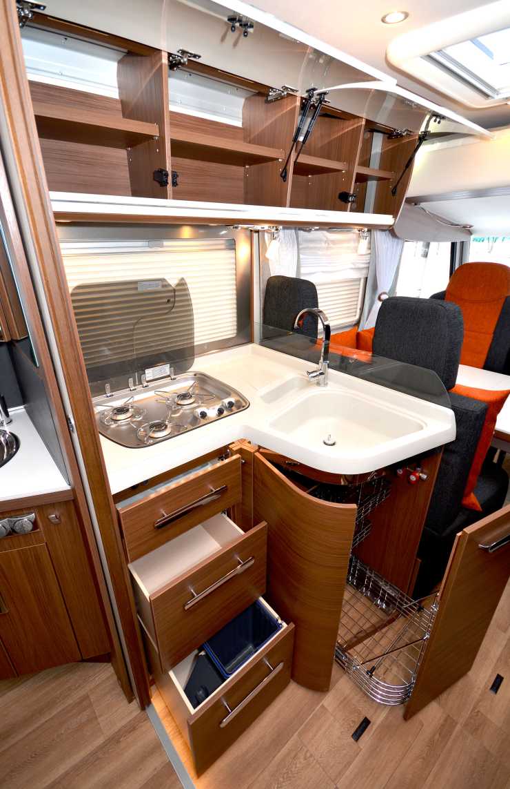 Sovrummet tar upp en stor del av husbilens yta vilket betyder att resten av bodelen i Arto 66 F blir något begränsat. Köket är vinkelformat och bakom kockens rygg finns kylskåp-fryskombination med mikro ovanför. Kökets förvaringsutrymmen räddas av ett smart kastrullskåp med tre utdragbara näthyllor. Skåpet har ett djup på 80 cm. Den trelågiga spisen från Dometic är lyckligtvis utrustad med ett tvådelat lock då avställningsytorna i köket är begränsade. Luckorna i överskåpen är stadiga konstruktionsmässigt med mycket bra gångjärn och självstängande funktion. Överskåpens bredd är 165 cm och löper vidare över soffgruppen. Längre fram finns soffgruppen som rymmer sex personer om man snurrar runt framsätena. Soffan med de bältade färdplatserna har bra bredd på 105 centimeter. Den går i vinkel och sidosoffan är 109 cm bred, men eftersom sittdelen är djup och bordet stort är mellanrummet till den vändbara förarstolen aningen trångt. Takbädden är lätt att sänka ner efter att man fällt ryggstöden på framsätena. Avståndet från golvet upp till madrassen är 130 cm men endast 88 cm från sidsoffan. Det behövs därmed ingen stege. Taksängens mått är 130x190 cm och sitthöjden från madrass till tak är 69 cm.