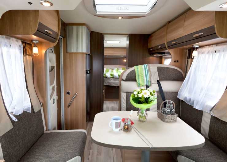 Köket har vinkelform och dess bakre långsidor mäter 90 x 90 centimeter. Den utstickande delen är rundad vilket förenklar framkomligheten. Under bänkskivan sitter en stor välvd lucka som höljer en låda och tre hål för vinflaskor, väldigt franskt, men kanske inte så yteffektivt. Förvaringen under den andra delen av köket består av tre utdragslådor. Den översta är en besticklåda. Den mellersta är en enorm låda. 40 x 40 centimeter och 35 centimeter djup, risken är att här blir ganska rörigt. Den nedersta lådan är drygt hälften så bred som lådfronten på grund av de gasreglage som är placerade här. Spisen är trelågig och har köksfläkt. I köket finns bilens två 230 V-uttag och ett 12 V-uttag. Sittgruppen, eller bilens vardagsrum om man så vill, är ett trevligt och ljust utrymme med en taklucka med infällda spotlights. Jag sitter skönt, speciellt på de bältade färdplatserna. Fem personer sitter bra kring bordet. Under färdplatserna finns färskvattentanken som relativt enkelt kan rengöras via två öppningar. Gråvattentanken är placerad under bilen och isolerad. Tyvärr kan man inte nå den inifrån bilen.