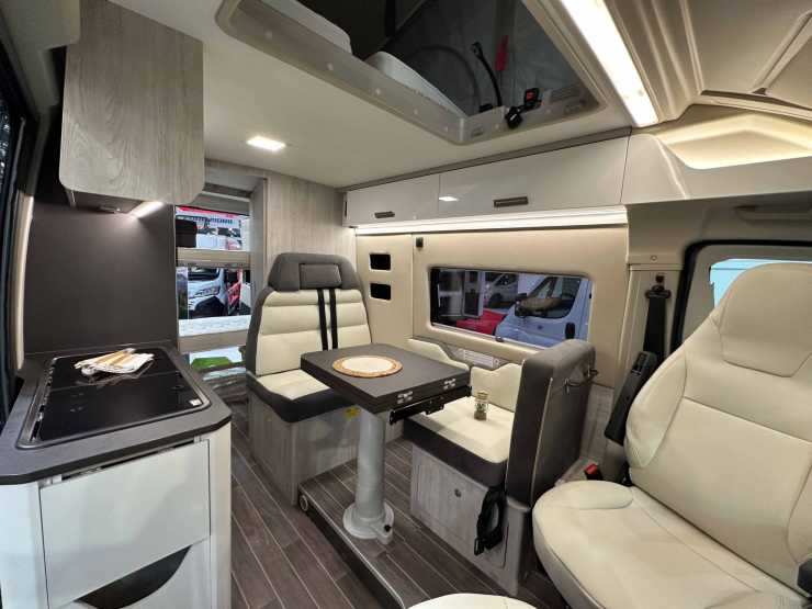 Utrymmet vid sittplatserna är generöst för att vara i ett så litet fordon. Soffan går att bygga ut med hjälp av en extra dyna, som extraknäcker som sidostöd när den inte behövs. På samma sätt kan bordet förvandlas till ett långbord och dras åt det håll man vill. Det är bara att hålla ner knoppen vid golvet med foten och manövrera. Bra om man är ute med barnen och det blir en regnig dag, då behöver man inte trängas, tycker säljaren.