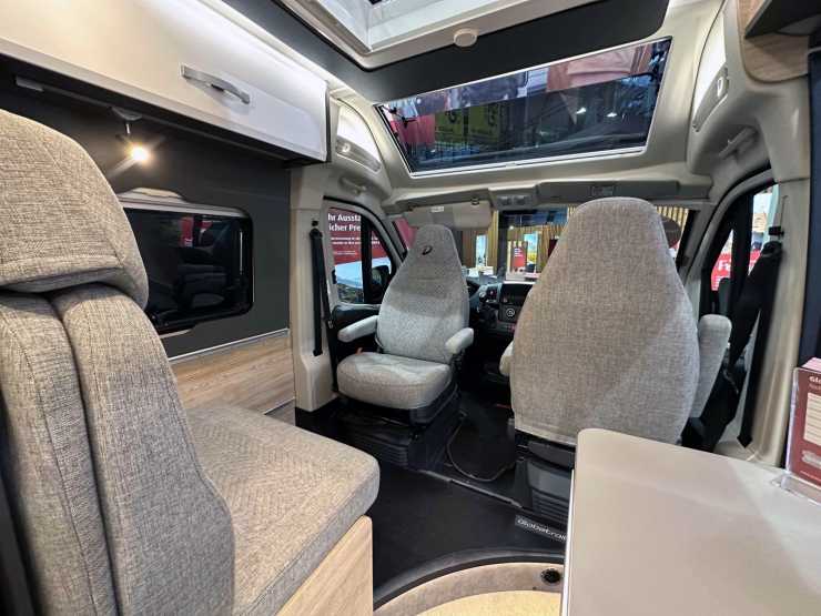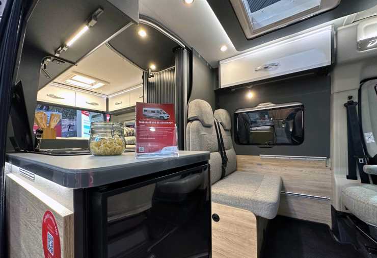 I just det här visningsexemplaret var bordet vid soffan borttaget. Smart om man är fyra passagerare som ska bältas fast och det kan ju funka – för det mesta äter man ju utomhus. För den som vill ha bord kan det vara bra att veta att det ingår i standardutrustningen.