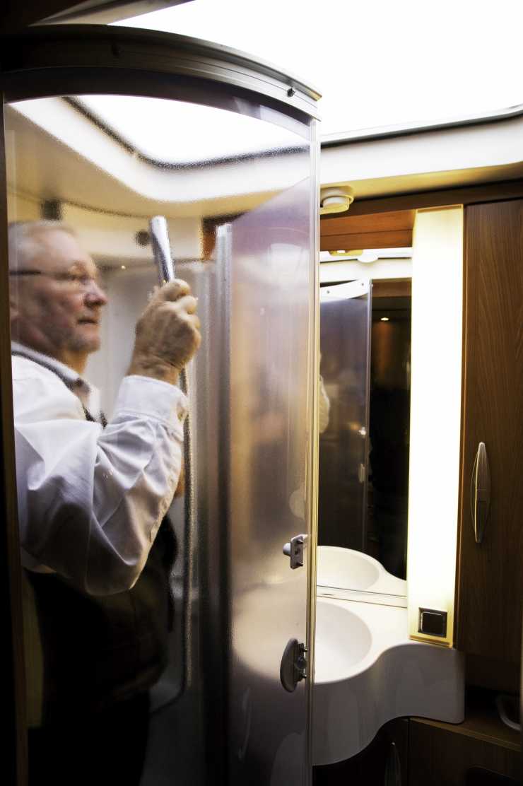 Mitt i bilen, på vänster sida, finns ett litet sanitetsutrymme med en golvyta på drygt en kvadratmeter. Det är trångt! Det går bra att sitta på toa-stolen, man kan även tvätta händer och borsta tänder men när det kommer till duschning så blir det knepigt. Jag är ingen sylfid till formatet, kanske lite lönnfet med mina knappt 90 kilo och ett midjemått kring metern, men när jag väl har fällt ut glasdörren och dragit den halvrunda skärmen på plats så kan jag inte utan vidare lyfta på armarna för att komma åt duschen. Alternativet är att duscha med öppen skärm och stänka ner hela toautrymmet, något som träinredningen inte kommer att må bra av.