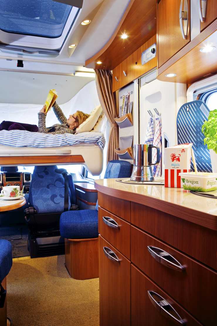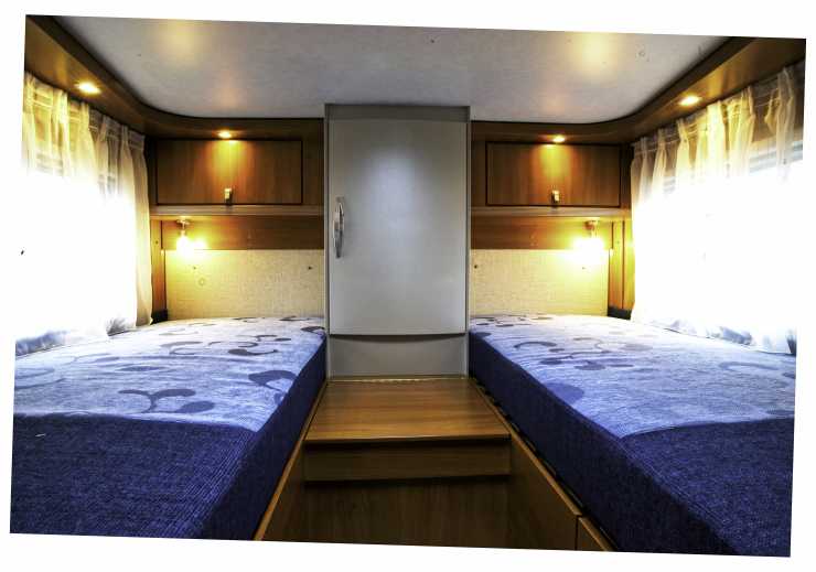 De två sängarna bak i bilen är upphöjda och nås med trappsteg som innehåller stuvutrymmen. Sängarna, som mäter 80 x 190 cm respektive 80 x 200 cm, har ribbotten och tjocka fasta madrasser. Under den högra finns en garderob som blir åtkomlig antingen genom en låg dörr eller genom att man lyfter på hela bädden och på det sättet öppnar utrymmet uppifrån. Som en liten gimmick finns det en fastmonterad hållare med ett skohorn i utrymmet. Under den vänstra sängen finns det ett motsvarande skåp.