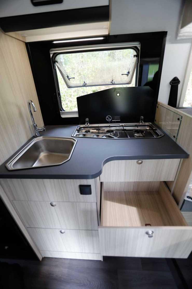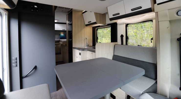 Ljuset flödar in från takfönstret och träinredningen med grå tygklädsel på soffor och sänggavel, förstärker det ljusa intrycket. Rakt fram från bodelsdörren finns köket. Den har trelågig spis, rymliga lådor och ett kylskåp på 142 liter som man når utan att behöva vända sig om. Extra plus för stänkskyddet mot soffdelen, men också minus för att det knappt finns några arbetsytor. Här gäller det att skala och hacka lök med ekonomiska rörelser.