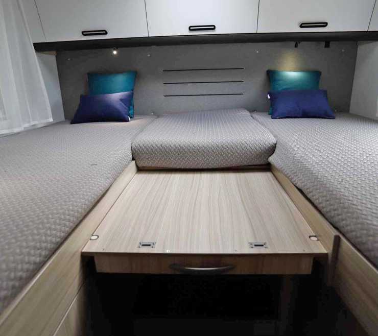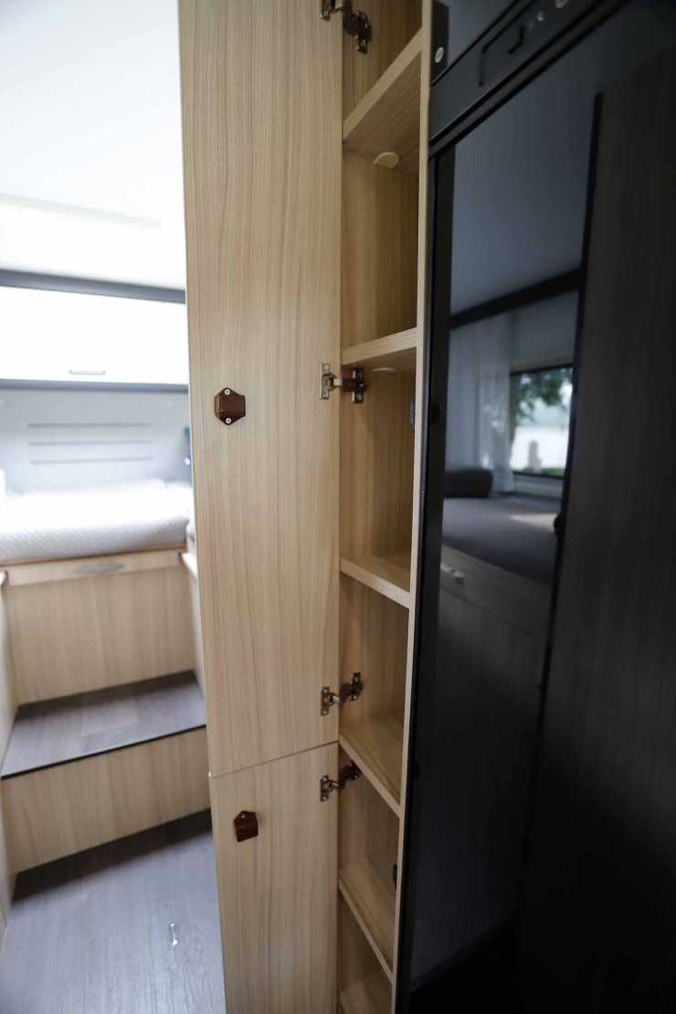 Nästa steg tar mig till långbäddarna längst bak. De går enkelt att bädda ut med en mittdel, som inte är hellång. Plats för små barn eller barnbarn – eller bara för att vräka sig lite mer – men inte för ytterligare en stor människa. Inget konstigt med det, det är som det brukar vara i den här typen av husbilar. Under bäddarna finns bra förvaring, liksom intill kylskåpet. Där har man klämt in ett smalt skåp med plats för Marie Kondo-rullade kläder eller hemtextil. (Googla Marie Kondo för packtips!)
