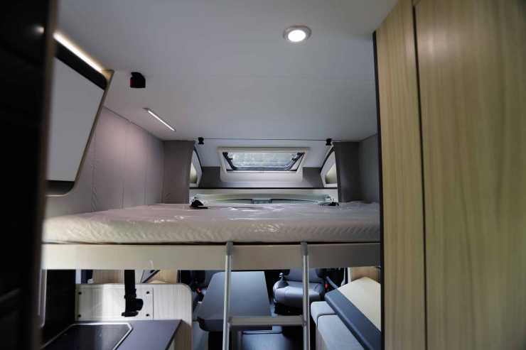 Ovanför dem finns takbädden som visserligen ser härlig ut, men den har måtten 190x125 cm och är sannolikt lite småtrång för två vuxna. Kanske är det här snarare en husbil för 2–3 personer, med möjlighet att ge en extra person skjuts en bit.