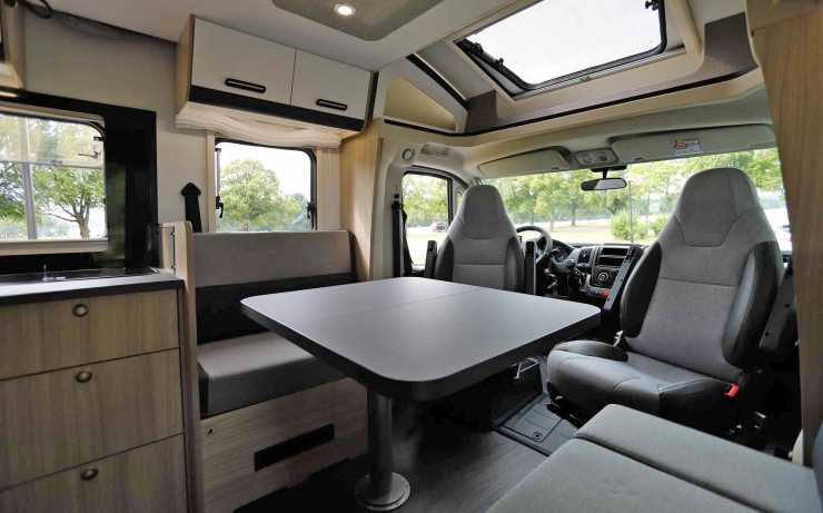 Sittdelen, med face to face-soffor och snurrbara framsäten, har helt okej med utrymme och ett bra bord. Här är det inga problem att sitta fyra personer, eller fem om man klämmer ihop sig. Möjligen ser de lite tråkigt fyrkantiga ut, som om någon designat dem i dataspelet Minecraft.