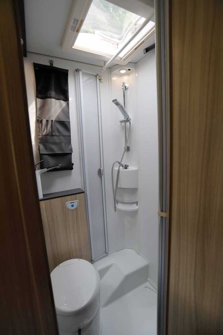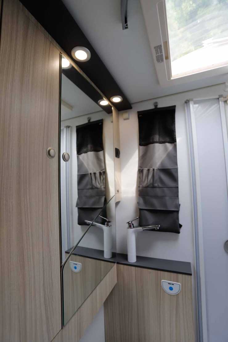Jag svänger till vänster och hamnar i sovdelen. Hygienutrymmet ligger mittemot köket. Det är inte stort och man känner igen vissa lösningar som Adria gillar: Det nedfällbara handfatet som döljs bakom en spegel, tygfickor för extra förvaring på väggen. Det senare en enkel och rätt billig detalj, men ändå omtänksam. Vem kämpar inte med tandborstar, tvålar och annat som har en tendens att sprida ut sig på toaletten? Helheltsintrycket är fräscht och ljust med fönster i taket.