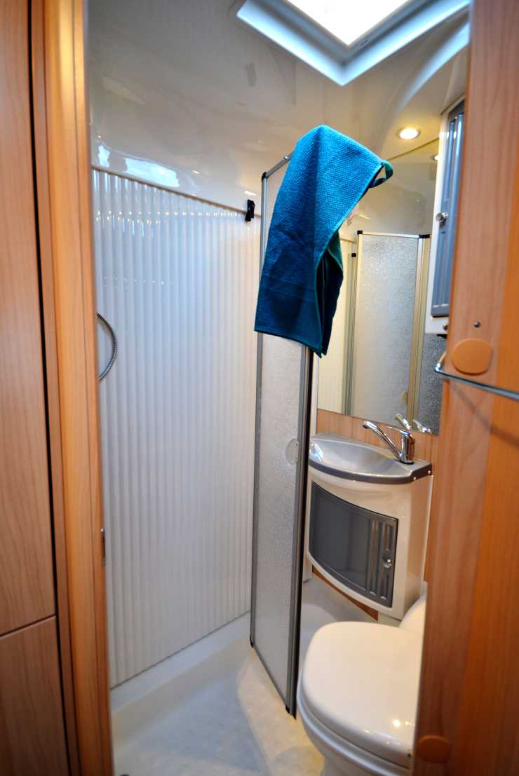 Sunlight har satsat på hygienutrymmet som är stort, 95x110 cm. Ståhöjden är exakt två meter. Den fiffiga duschen kan med hjälp av tvådelade väggar avgränsas till ett ordentligt utrymme med två avlopp. Toaletten från Thetford är vridbar vilket är bra. Hygienutrymmets skåpdörrar skulle behöva två magneter i stället för en, då skulle de inte orsaka buller vid körning vilket de gör nu. Det finns gott om förvaring och dörrarna är utrustade med handdukskrokar. Intill toaletten finns en rymlig garderob och under denna sitter värmepannan Truma Combi 6 som har fyra utblås spridda i bilen. Det räcker gott för ett boendeutrymme i denna storlek, men det ska nämnas att detta är ingen vinterhusbil. Bredvid garderoben finns kylskåpet på 113 liter med plats för ugn ovanför. Under kylskåpet finns ett skåp för förvaring.