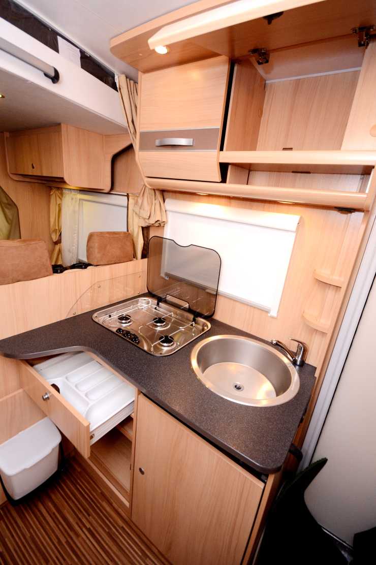 Köket med spis och diskho finns på höger sida av bilen medan kylskåpet finns på andra sidan mittgången. Den trelågiga spisen och den runda diskhon tar upp det mesta av den 111 cm långa köksbänken. Här frågar vi oss om det verkligen är nödvändigt med en trelågig spis i den i övrigt så kompakta bilen. Ovanför köksbänken finns två överskåp och under finns ett stort skåp, en låda för bestick samt ett skåp med sopkorg. Sammanlagt finns det gott om förvaringsutrymmen i och omkring köksavdelningen. Det finns 230 volts och 12 volts uttag och ljus får man av två spotlampor och ett fönster på 70x40 cm. Sittgruppen domineras av en sidosoffa på 142 cm. Det finns två traditionella färdplatser i den tvärställda soffan, som ovanligt nog placerats på bilens högra sida i färdriktningen. Sittgruppen rymmer sju personer och bordet (104x52 cm) kan förlängas med 20 cm med en platta som placeras mellan bordet och väggen.