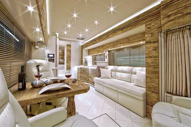 Visst kan det vara så. Även om smak är svårt att diskutera så får väl alla hålla med om att interiören i den här husbilen är något som verkligen sticker ut. Den är kompromisslös, bekväm och avantgardistisk så det förslår.