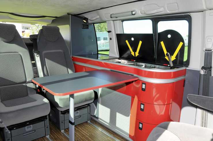 Köksmodulen består av en tvålågig gasolspis, diskho som även fungerar som tvättho. Längre bak i modulen finns kyllåda med lucka upptill. Längst bak återfinns vattentank och gasolutrymme för en gasolflaska på 2,8 kg. Annars är den här husbilen ett under av möjligheter och mångsidighet. Väljer man konceptet med sex sittplatser kan bilens planlösning varieras i en mängd varianter.