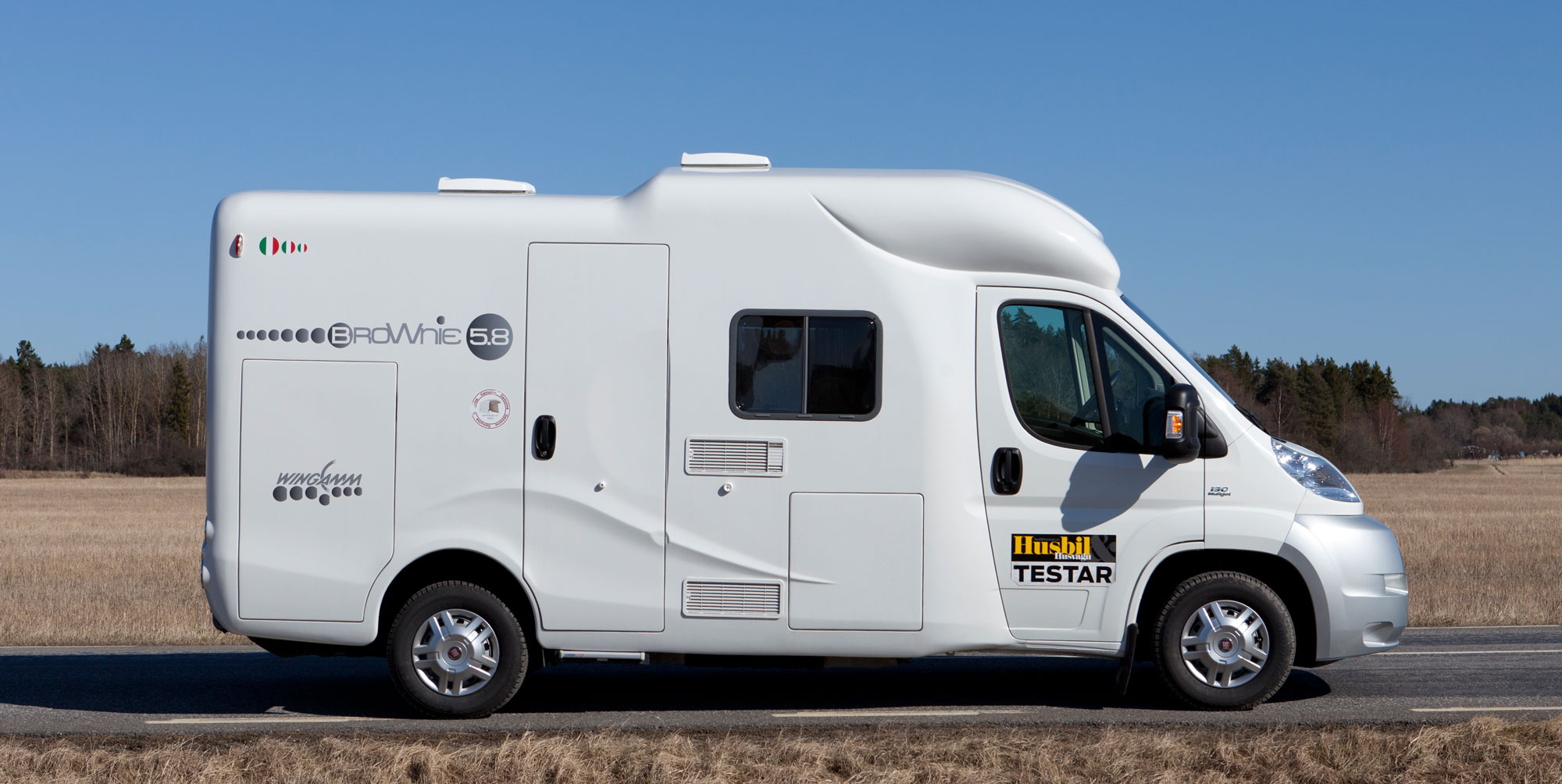 Wingamm är en liten tillverkare av fritidsfordon med säte i Verona, Italien. Det är ett familjeföretag som till en början byggde möbler åt husvagnstillverkare. 1977 tog de steget till att själva bygga fritidsfordon. I dagsläget bygger de cirka 200 fordon per år fördelat över tre husbilserier och en liten husvagn. Förra året fick Wingamm en nordisk agent i form av Wingamm Scandinavia AB. Det finns tre olika grundvarianter av Wingamms senaste serie, Brownie. Den bil vi testar, och i fortsättningen kallar bilen, heter Wingamm Brownie 5.8 GL. Den har en planlösning som påminner om en traditionellt byggd halvintegrerad bil i och med att den har fasta sängplatser i kombination med en taksäng. De andra varianterna av Brownie har enbart taksängar. Minstingen Brownie 5.0 är endast 5,25 meter lång. Chassiet är den största enskilda faktorn som körtekniskt särpräglar denna bil. Husbilar med liknande mått som denna bil har vanligtvis originalchassin. Vår bil är däremot utrustad med ett måttbeställt Al-Ko-chassie. Det är sänkt med 220 millimeter, det lägsta Al-Ko sänker en bil baserad på Fiat Ducato. Den bakre spårvidden är 1 860 millimeter vilket är mellan de två olika spårvidder Fiat erbjuder till sina chassien. Överhänget bak på bilen är endast cirka en meter, vilket bara är drygt tio centimeter mer än överhänget fram. Chassiet är varmförzinkat vilket är bra ur rostsynpunkt. Likväl är vår rekommendation att bilen rostskyddsbehandlas. I förhållande till vad bilen kostar är det en bra investering, speciellt om man väger in andrahandsvärdet. På tvärbalken längst bak sitter en dragkrok monterad. Med den får man dra som mest 2 000 kilo.