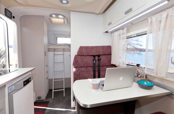 Längst bak i bilen finns en tvärställd våningssäng. Den övre slafen kan vara lite knölig att äntra. En stege krävs och det är ganska smalt mellan garderoben och hygienutrymmet. Väl på plats ligger vi hyggligt bra. Sängen smalnar av i ena änden.Läslampa och fönster finns vid båda sängarna. Vi väljer att endast använda den övre sängen. Den undre fäller vi upp för att få till ett lastutrymme. Det blir ett helt okej lastutrymme komplett med läslampa, fönster och gardinstång. Något man går miste om när garaget används är sikten bakåt. Hygienutrymmet är stort i förhållande till övriga utrymmen. Handfatet med avställningsytor är gjutna i ett stycke glasfiber. Det finns både 12 V och 230 W kontakter, det senare gömt i skåpet under handfatet. Ett stort fönster finns men ingen gardinstång. Vill man vara ifred får mörkläggningsjalusin användas. Designmässigt känns det funktionellt plastigt, lite som ett passagerarflygplan. Framför hygienutrymmet finns dinetten. Den är i minsta laget. Två välmående personer får problem att sitta i de två motstående sofforna. Normalmående personer får det enklare och tunnisar kan nog trivas riktigt bra. Om färdplatserna skall användas kan bordet skjutas fram en aning eller helt tas bort. Under den främre soffan finns förvaring som passar för saker man inte använder så ofta. Kuddarna måste tas bort för att man ska komma åt utrymmet. Under den bakre soffan finns endast en liten utdragbar låda. Resten av utrymmet upptas av teknisk utrustning. Ovanför fönstret finns två överskåp. I det ena finns fördragna ledningar till tv och solpanel.
