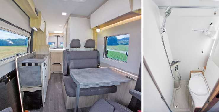 Köket vid skjutdörren har en stor, infälld vikbräda som förlänger arbetsytan. Kompressorkylskåpet mellan köket och sängen. Bredden på mittgången till badrummet mittemot är 51 centimeter. Längre fram, mellan köket och sittbänken, smalnar gången av till 40 centimeter, vilket är typiskt för en Sprinter. Sittgruppen har plats för fyra personer.