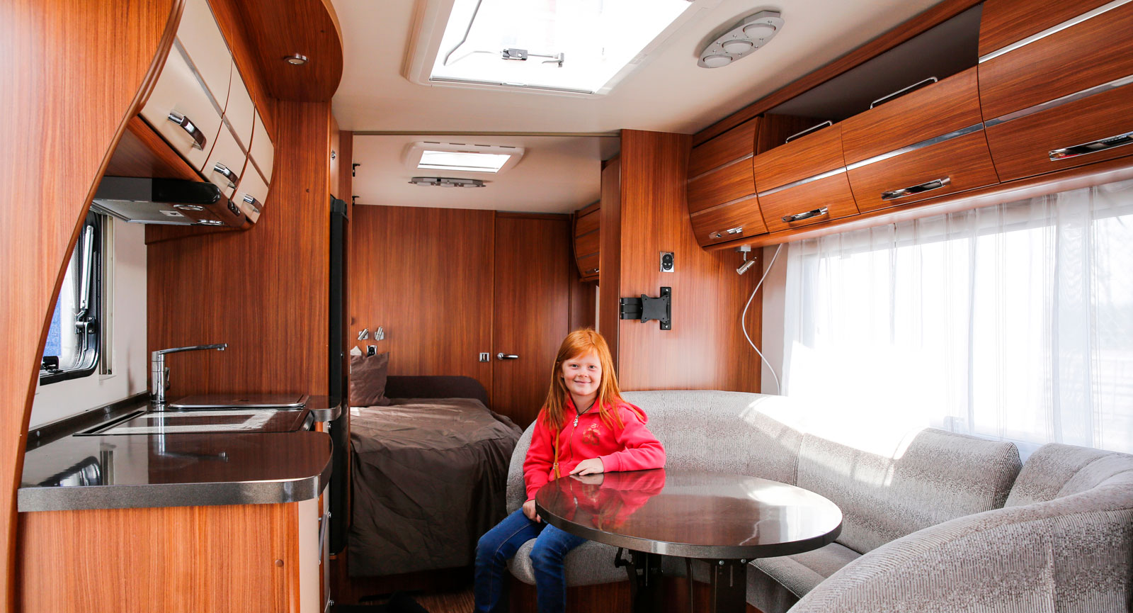 Det är gott om plats i Adria Alpina 743 UP. Förutom den sedvanliga u-soffan i fronten finns även denna trevliga sittgrupp i mitten.