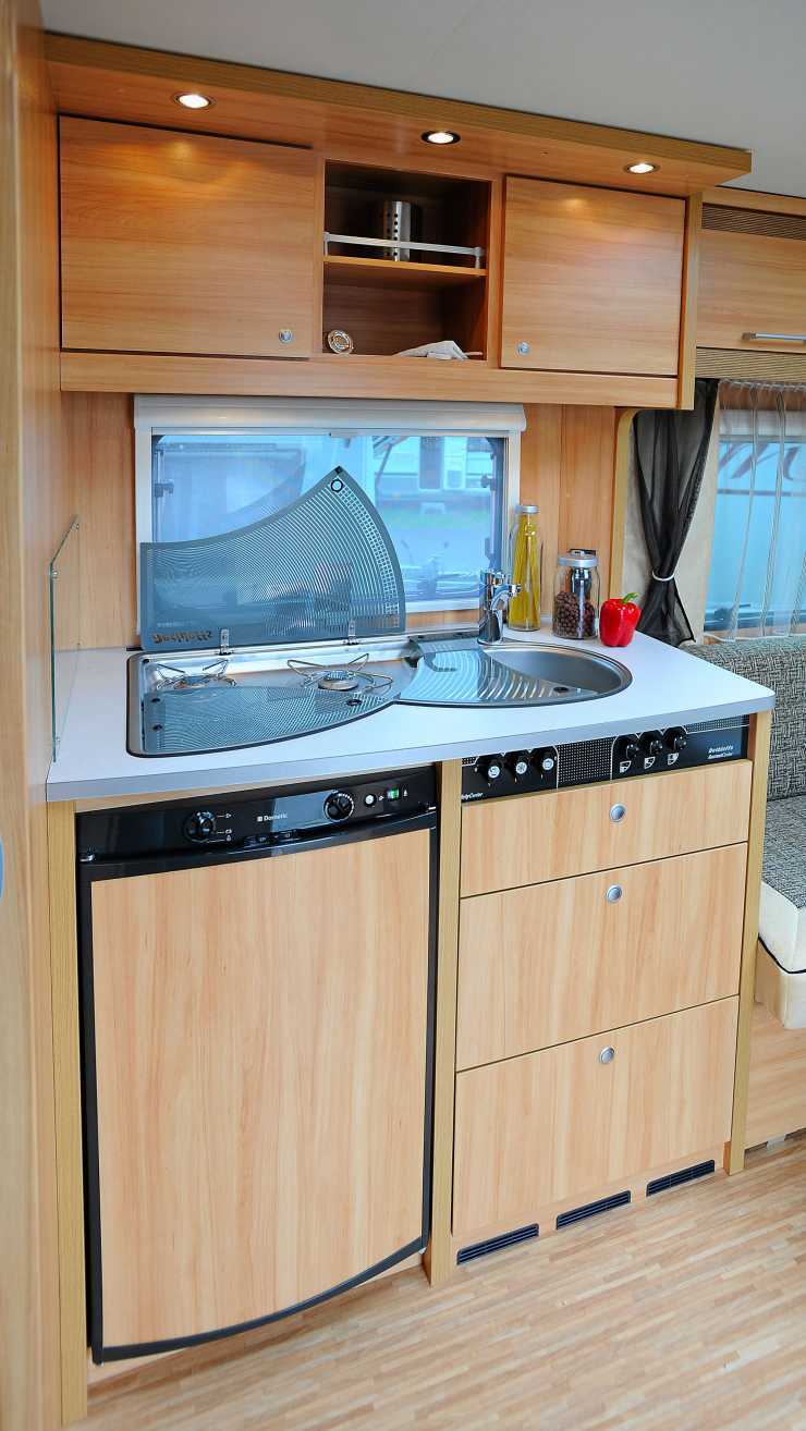 När det gäller köket är också de fria ytorna och luftigheten påtaglig med en reservation för att det kunde behövts lite fler avställningsytor på bänken över det stora kylskåpet. I och för sig har Dethleffs utnyttjat erfarenheterna från sina designstudier och utrustat vagnen med de nya delade glaslocken över både vask och gasspis men lite mer utrymme hade uppskattats av kocken om han/hon skall förse boende och gäster i den rymliga sittgruppen med middag.