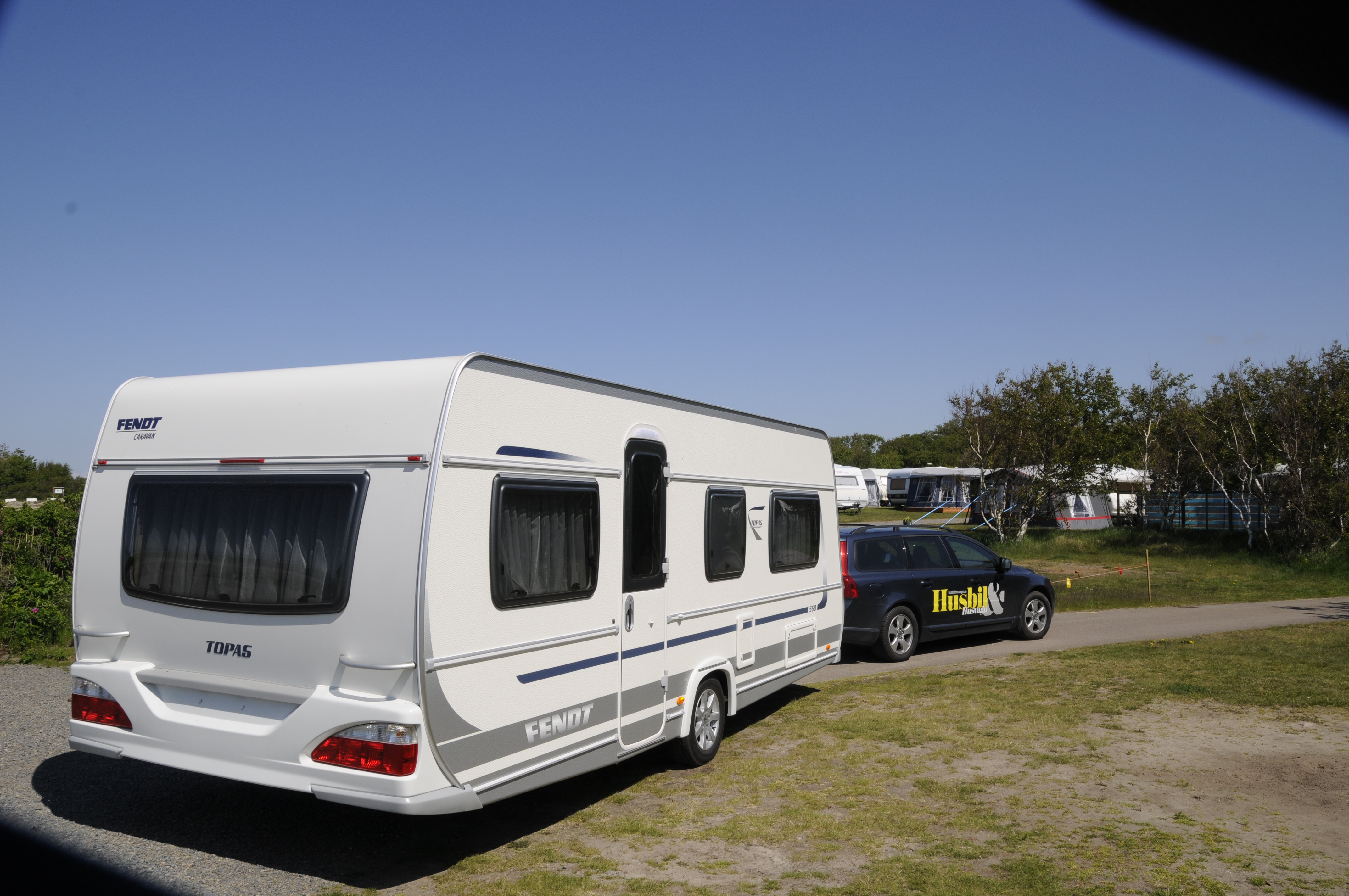 Väl framme vid målet, Tylösands camping, tilldelas jag en vackert belägen plats under ett träd längs en smal campinggata. Den breda vagnen är följsam även baklänges och tack vare att Topas 560 TG inte är så jättelång utgör det inga problem att hålla reda på bakändans överhäng. Jag kan, utan att skämmas, ta av mig solglasögonen när vagnen väl står på plats.