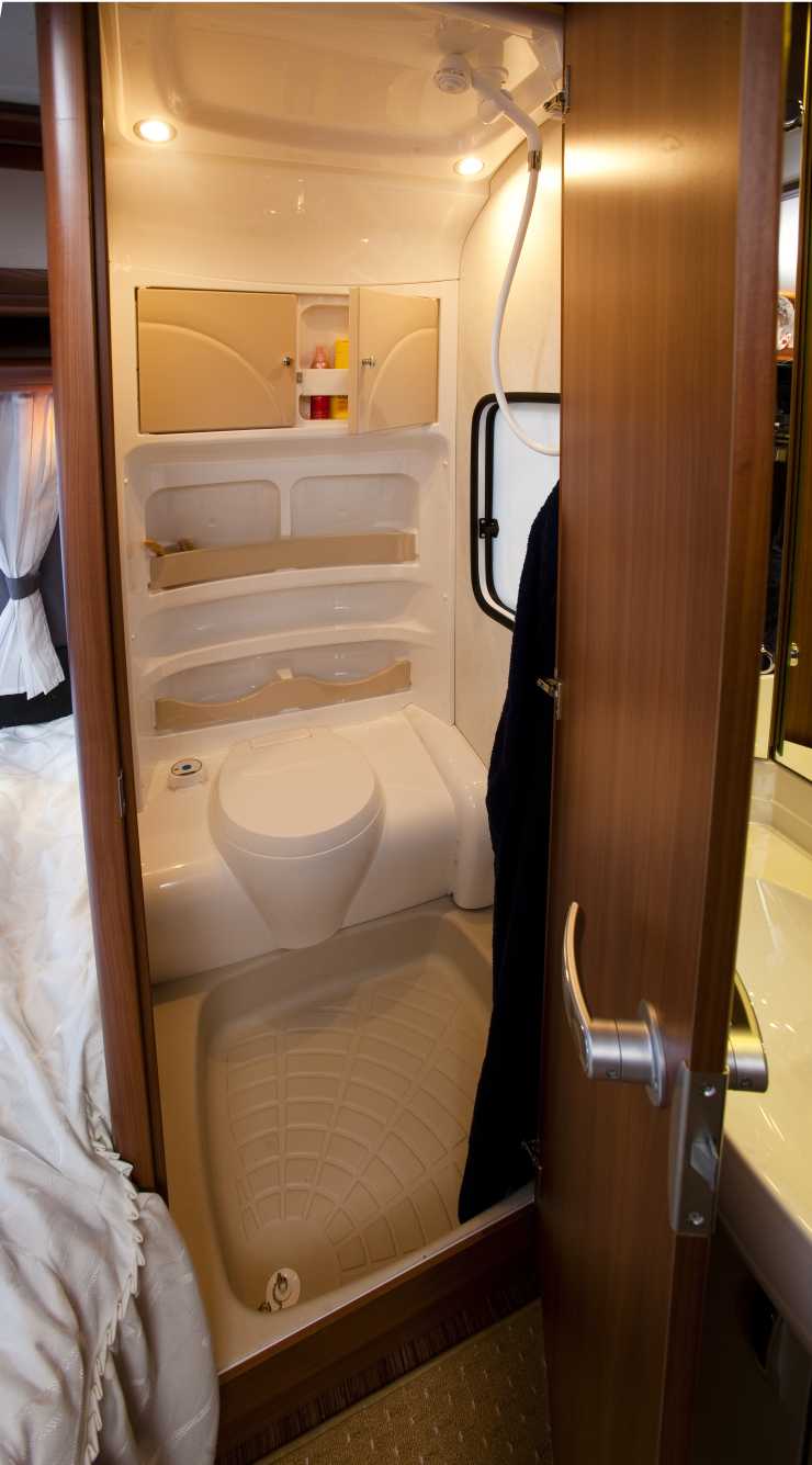 För att komma åt stuvutrymmena under huvudbädden kan hela sängen lyftas upp med hjälp av gasfjädrar som även håller den i uppfällt läge. Huvudändans hörn flankeras av två små hyllor och lika många läslampor. Hela sov- och toalettutrymmet kan privatiseras med skjutdörrar som dock bara hindrar insyn någon ljudspärr är det inte frågan om.