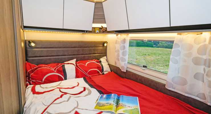I den stora garderoben har Alde-pannan placerats och ovanför den finns en droppskiva med ventilationshål där värme tar sig upp från pannan. Ett perfekt utrymme för att torka fuktiga kläder snabbt. En annan smart detalj, när vi är inne på ämnet ordning och reda, är skidfacket längst fram. Sedan kan vi fortsätta det praktiska med att sofflådorna kan lyftas så att man kommer åt vid städning. En sak som avslöjar att vagnen är byggd i ett land med mörka vintrar är den fina belysningen. Här finns dessutom gott om kontakt– och USB-uttag. Samt två bra platser för tv, dels vid entrén och dels vid sängen.